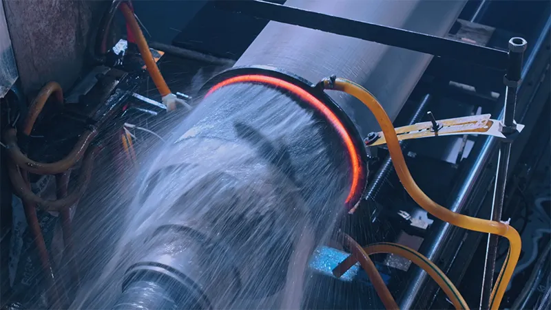 A multi-stage heat treatment process is applied, including repeated stress relief and medium-frequency surface hardening, ensuring a surface hardness of HRC > 58 (HS 73–80) with uniform hardness across the entire roll and no soft zones.